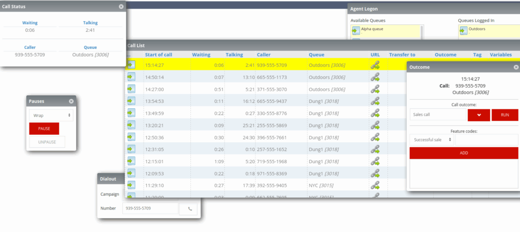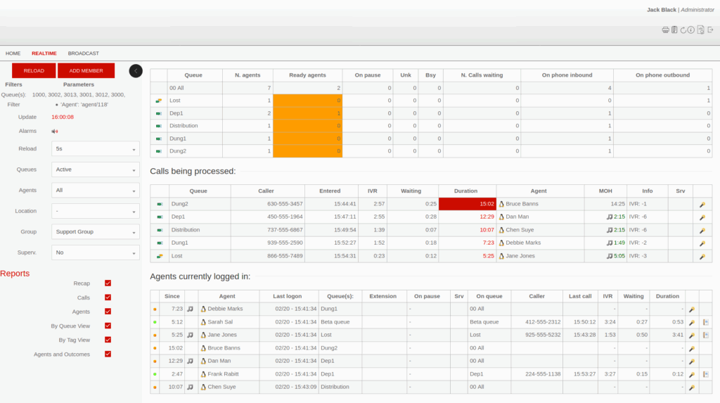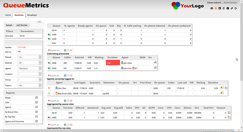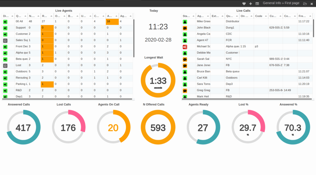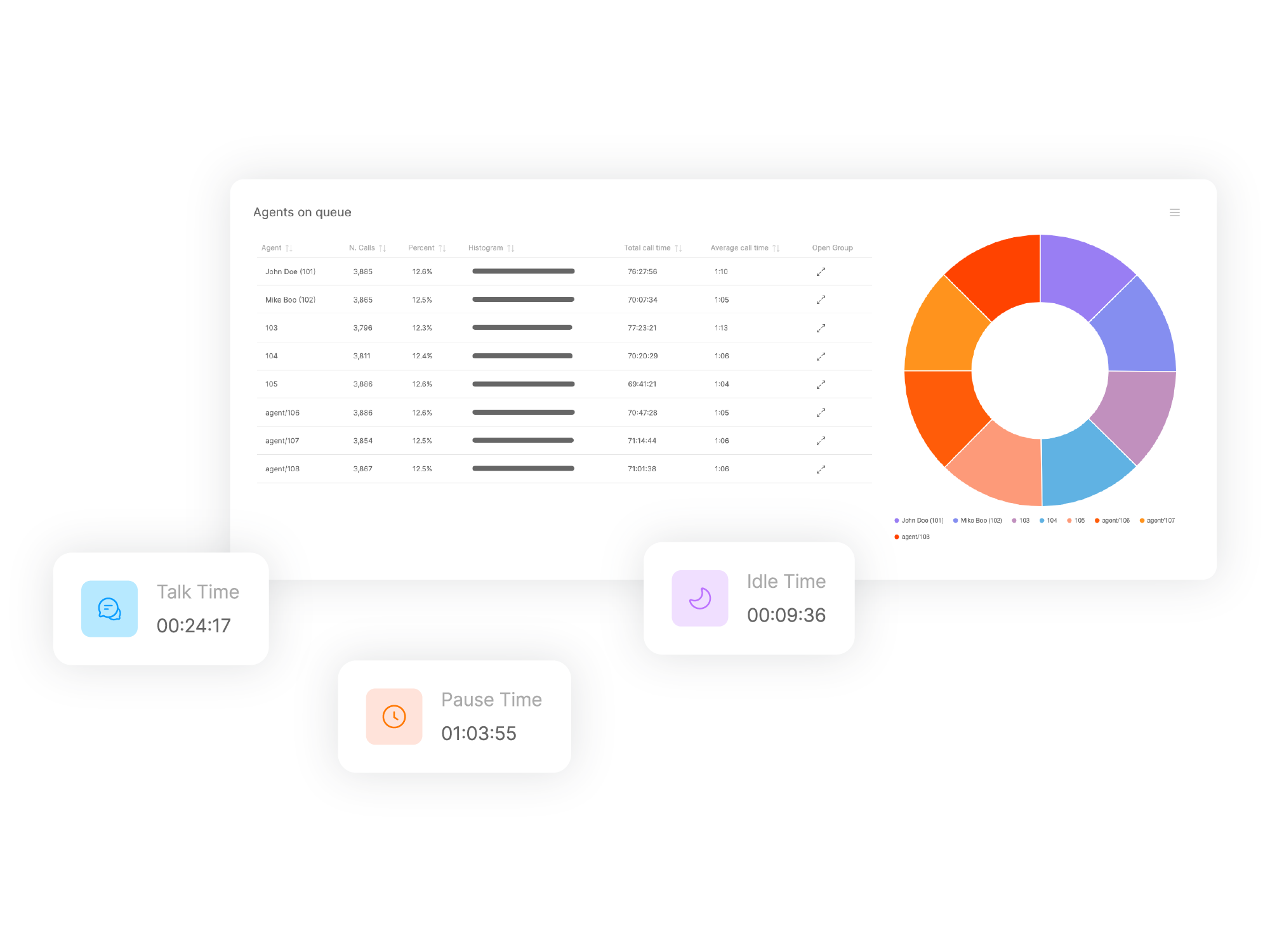 La plataforma de centro de llamadas QueueMetrics le permite monitorear la productividad y el tiempo de trabajo de sus agentes, los objetivos de ventas, las tasas de conversión, los eventos de ACD, IVR y música en espera.